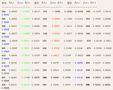 bg(G0)-Cg(G0)。此時,輔助用的“綠原色”光的量g,*是該段光譜色三刺激值“負值”的大小。查表可知,它的*大值發生在425nm。數值大小是0.00143。